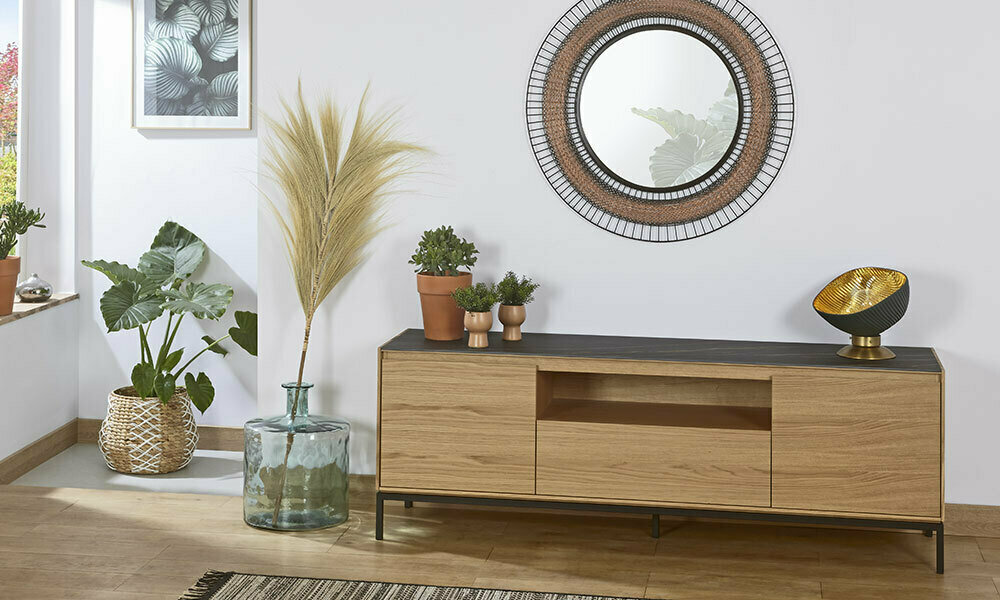Le meuble TV en chêne Alamy profite de plusieurs avantages. Tout d’abord, celui d’accueillir dans votre salon une télévision grâce à sa surface spacieuse : 175 (L) x 45 (l) x 46,5 (h) cm. Vous pourrez aisément installer votre écran plat de taille standard et même disposer d’un espace supplémentaire sur les côtés pour vos petites décorations.