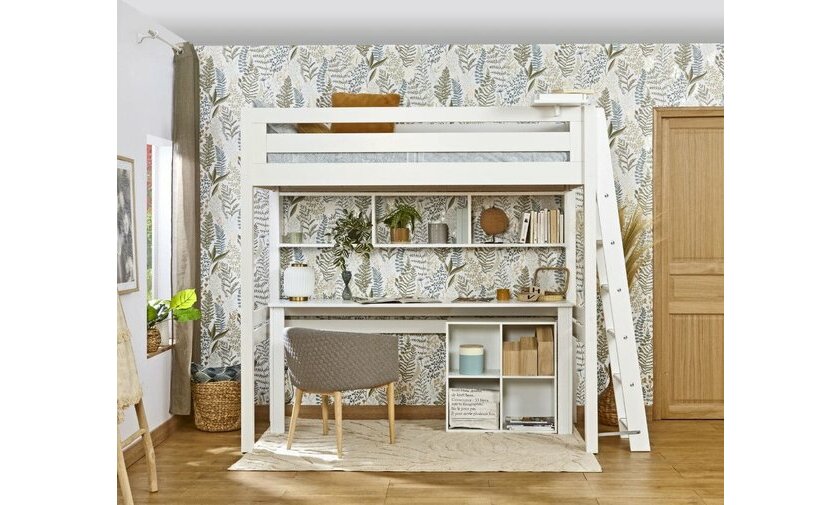 Le lit mezzanine est une solution gain de place idéale pour optimiser une chambre à coucher ou un studio. Grâce à son couchage en hauteur, le lit mezzanine Abel libère de l’espace au sol. De hauteur 1,58 m, cet espace sous le sommier est à aménager selon vos besoins. Si vous manquez de rangements, vous pouvez y placer une bibliothèque ou des étagères par exemple. Cet espace peut également être aménagé en coin travail grâce au bureau de la même collection. Ce lit gain de place vous fait gagner quelques mètres carrés non négligeables lorsqu’on dispose d’une pièce de petite superficie.