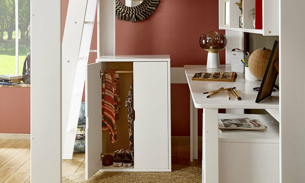 Cette armoire présente une grande capacité de rangement et est disponible en plusieurs coloris sobres pour s’associer facilement à votre lit mezzanine ou à la décoration de votre pièce.